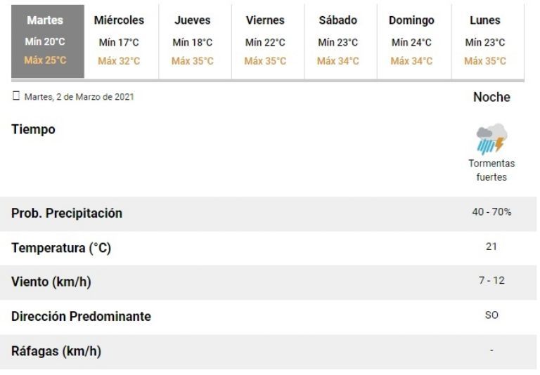 En ese marco, el Servicio Meteorológico Nacional renovó la alerta por tormentas. Según el pronóstico, para noche de este martes, habrá un 70% de probabilidades de precipitaciones.