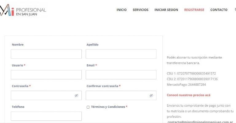 Para poder ofrecer los servicios, se debe ingresar a la página (https://miprofesionalensanjuan.com.ar/), ir a "registrarse" y, una vez que se crea una cuenta, ya se puede detallar la profesión o realizar una breve descripción respecto de lo que se dedica. Entre los detalles, lo ideal es que expliciten el servicio al que se dedican, la especialidad, número de contacto, mail y todo lo que deseen exponer.