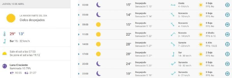Según el pronóstico, este jueves se verán principalmente cielos despejados en San Juan. Las temperaturas oscilarán entre 13° y 29°, cuya máxima se alcanzará sobre las 16. A lo largo del día, prevalecerá el viento moderado del Sur, con rachas que podrán llegar hasta 32 km/h por la noche.