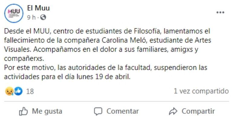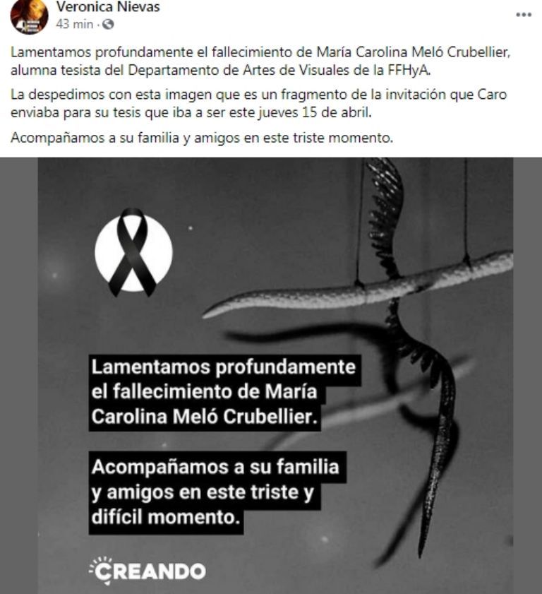 Se trata de Carolina Meló, quien se encontraba preparando la tesis para recibirse de la Licenciatura en Artes Visuales. Según trascendió, la joven tenía pensado rendir su tesis el pasado 15 de abril, pero tres días antes, el 12, recibió una descarga eléctrica en su casa, en Capital. Estuvo hospitalizada hasta este domingo, cuando falleció.