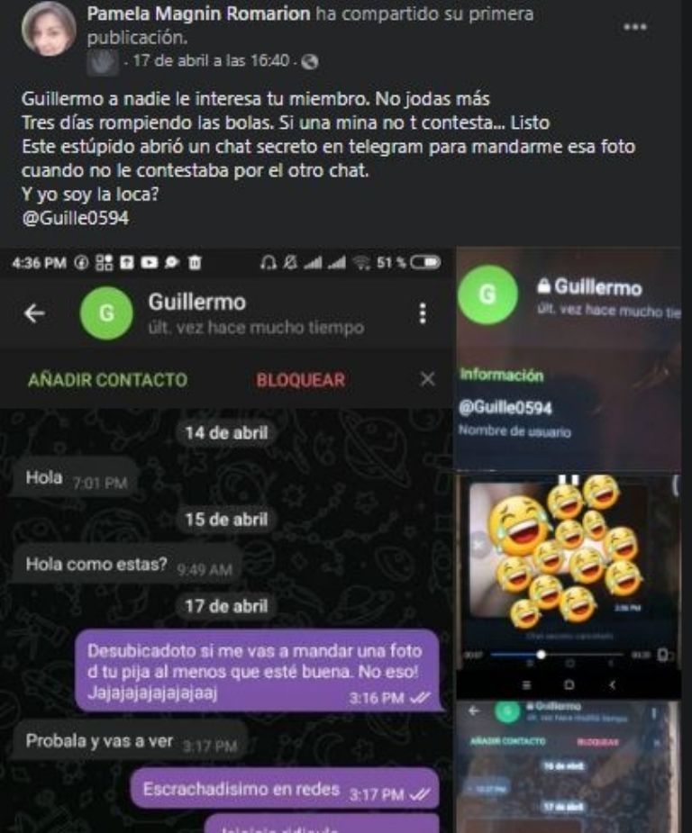 Según hizo público la receptora de las imágenes, el sujeto, un acosador cibernético de nombre "Guillermo", creó un fallido chat secreto en la plataforma Telegram porque ella no le contestaba los habituales de WhatsApp.