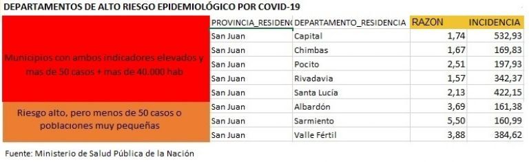 -Según el último análisis difundido por Nación, realizado al 15 de abril, a semana epidemiológica 14 cerrada, San Juan aparece con 5 departamentos considerados de alto riesgo: a Capital, Rivadavia y Santa Lucía se le suman ahora Chimbas y Pocito. Además, aparecen novedades: Rawson se considera de riesgo moderado. Y tres comunas nuevas que figuran en rojo, que no entran en la categorización de riesgo epidemiológico porque no son de más de 40.000 habitantes, pero sí están señaladas por Salud Pública de Nación como "de riesgo alto, pero con menos de 50 casos o poblaciones muy pequeñas", que son Albardón, Sarmiento y Valle Fértil.
