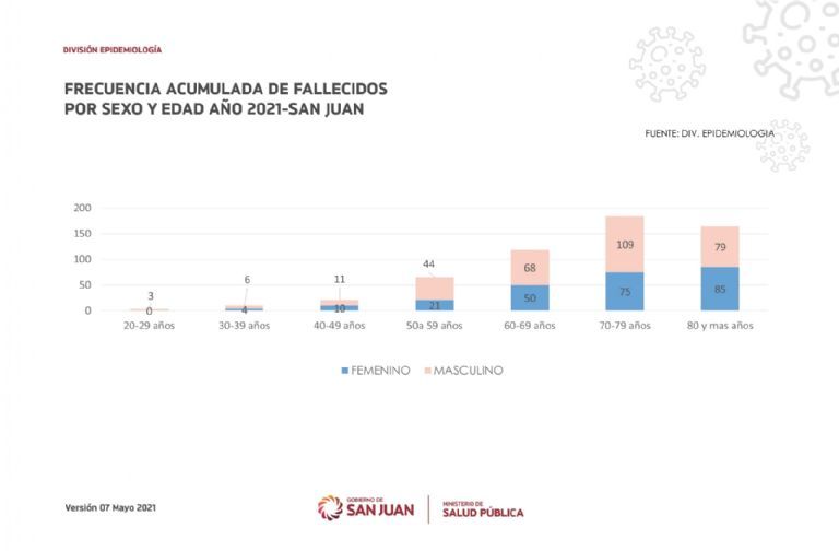 Según el informe sobre la pandemia en San Juan dado a conocer el sábado por Salud Pública, correspondiente a la semana epidemiológica 18, la frecuencia acumulada de fallecidos en los años 2020-2021-San Juan arroja una tasa de letalidad de 1,88 cada 100 positivos y una tasa de mortalidad de 71,56 cada 100.000 habitantes.