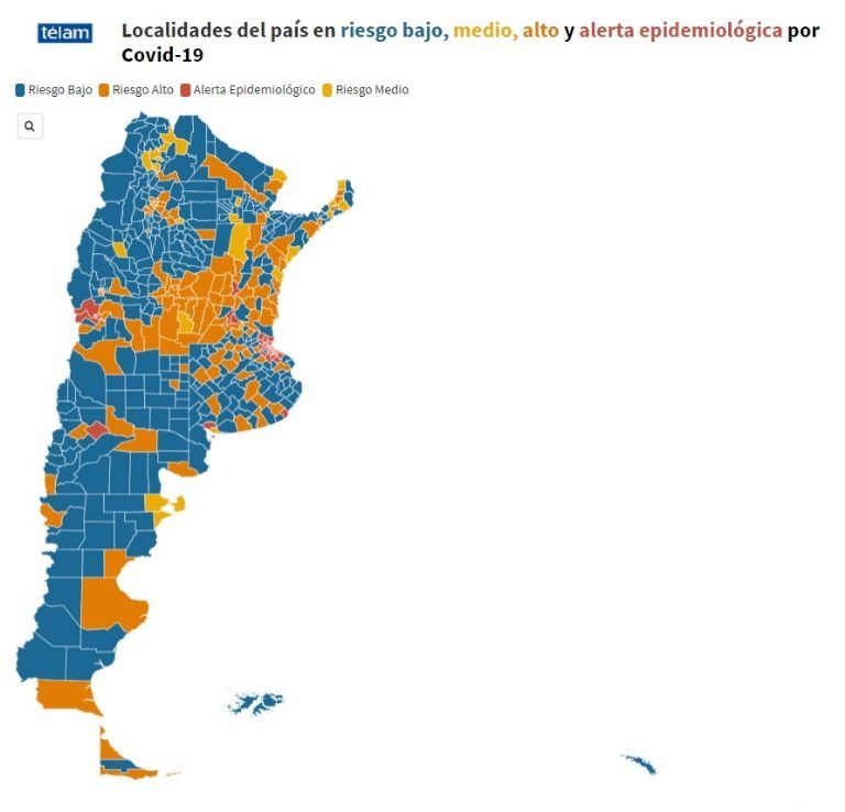 Asimismo, en medio riesgo epidemiológico sanitario se encuentra la localidad entrerriana de Federación; la formoseña de Pilcomayo; las jujeñas Dr. Manuel Belgrano, El Carmen y Ledesma; la riojana de Chilecito; las misioneras Guaraní, Iguazú, Libertador General San Martín y Oberá; la tucumana Faimallá; en Salta, la Capital, Cerrillos, Orán y Rosario de Lerma; y Vera, en Santa Fe.