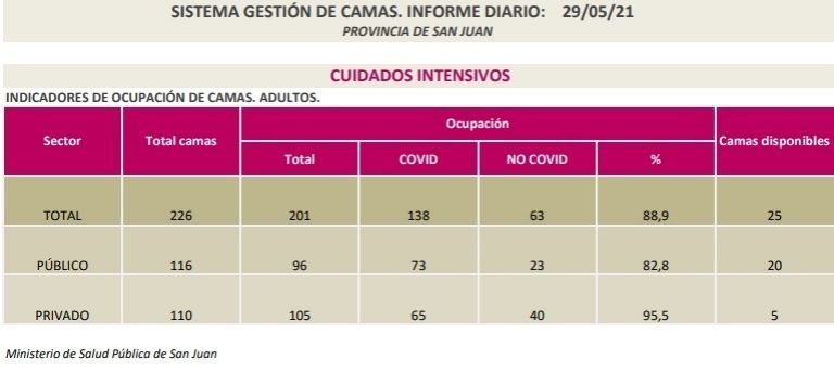 Este sábado, el Ministerio de Salud Pública informó la ocupación de las Unidades de Terapia Intensiva de San Juan. La cifra es alarmante: el 88,9% está cubierto. Representa una suba en relación a la jornada anterior, de 86,7%. Sin embargo, supera nuevamente la media nacional, que es del 76,9%.