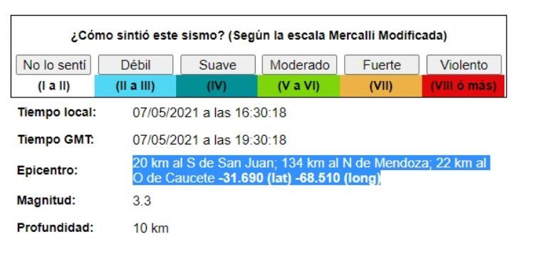 Según los datos aportados por el Instituto Nacional de Prevención Sísmica el movimiento tuvo una magnitud de 3.3, con una profundidad de 10 km. Su epicentro fue 20 km. al sur de la provincia y 22. km. al oeste de Caucete.