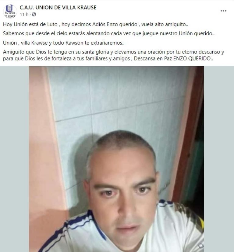 "Hoy Unión está de Luto, hoy decimos Adiós Enzo querido, vuela alto amiguito..". Al mismo tiempo señalaron "Sabemos que desde el cielo estarás alentando cada vez que juegue nuestro Unión querido...", posteó en las últimas horas en las redes el club Unión de Villa Krause, debido al fallecimiento de uno de sus más queridos y populares hinchas. Se trata de Enzo, conocido en El Azul desde hace años por su apoyo incondicional como seguidor del equipo rawsino.