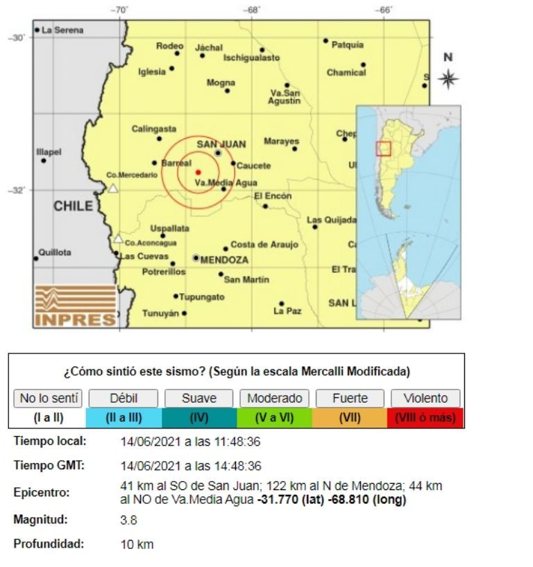 Minutos antes del mediodía de este lunes, un fuerte sismo sacudió el suelo sanjuanino. Según los datos del Instituto Provincial de Prevención Sísmica (INPRES), fue de 3.9 grados de magnitud y una profundidad de 10 kilómetros.
