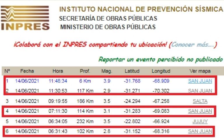 Según el INPRES, durante en lo que va del lunes se registraron cuatro sismos en la provincia: el primero fue a las 6:31, de 2.8 grados de magnitud; el segundo fue a las 7:11, con una intensidad de 3.1; el tercero fue a las 11:30, con una intensidad de 2.9 grados y el último fue a las 11:48, con una intensidad de 3.9 grados.