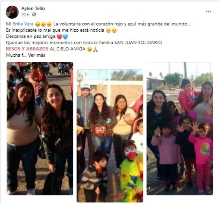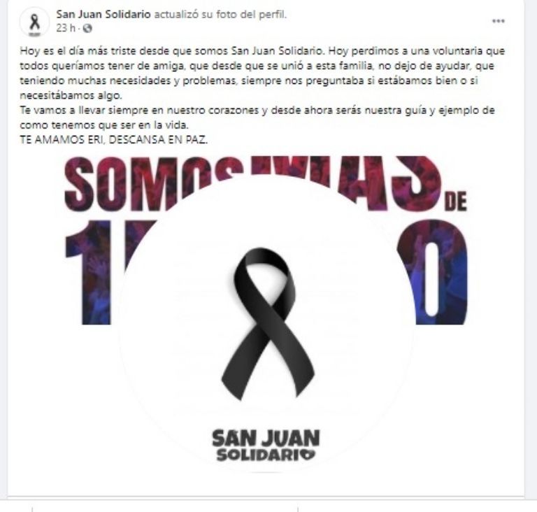 Erika formaba parte del grupo San Juan Solidario, quien emitió un comunicado a través de sus redes sociales lamentando la triste partida. “Hoy es el día más triste desde que somos San Juan Solidario. Hoy perdimos a una voluntaria que todos queríamos tener de amiga, que desde que se unió a esta familia, no dejo de ayudar, que teniendo muchas necesidades y problemas, siempre nos preguntaba si estábamos bien o si necesitábamos algo”, comenzó el mensaje.