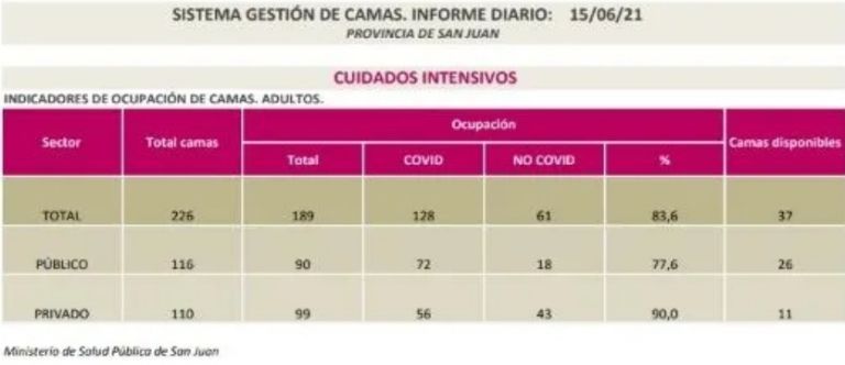 Este martes, el Ministerio de Salud Pública informó la ocupación de las Unidades de Terapia Intensiva de San Juan. La cifra es alarmante: el 83,6% está cubierto. Supera nuevamente la media nacional, que es del 76,4%.