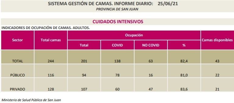 El Ministerio de Salud Pública informó la ocupación de las Unidades de Terapia Intensiva de San Juan. La cifra es alarmante, pero estable en relación a los informes de jornadas pasadas: el 82,4% está cubierto. Es un porcentaje mayor a la media nacional, que es del 72,4%. En la provincia hay 201 pacientes internados.