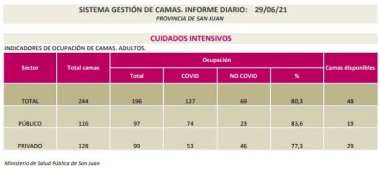 El Ministerio de Salud Pública informó la ocupación de las Unidades de Terapia Intensiva de San Juan. La cifra es preocupante, pero en relación a los informes de jornadas pasadas, es la tercera baja consecutiva: el 80,3% está cubierto. Es un porcentaje mayor a la media nacional, que es del 69,2%. En la provincia hay 196 pacientes internados.
