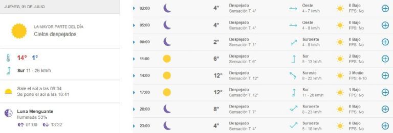 Según el pronóstico, este jueves se verán principalmente cielos despejados. Las temperaturas oscilarán entre 1° y 14°, cuya máxima se alcanzará sobre las 15.