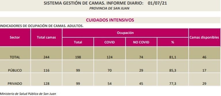 El Ministerio de Salud Pública informó la ocupación de las Unidades de Terapia Intensiva de San Juan. La cifra es preocupante, pero se mantiene estable en relación con los partes anteriores: el 81,1% está cubierto. Es un porcentaje mayor a la media nacional, que es del 66,3%. En la provincia hay 198 pacientes internados.