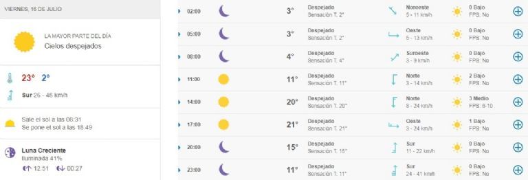 Según el pronóstico, este viernes se verán principalmente cielos despejados en San Juan. Las temperaturas oscilarán entre 2° y 23° durante el dia, cuya máxima se alcanzará sobre las 16. Habrá viento Zonda, calidez y sequedad.