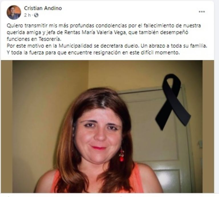 "Quiero transmitir mis más profundas condolencias por el fallecimiento de nuestra querida amiga y jefa de Rentas María Valeria Vega, que también desempeñó funciones en Tesorería. Por este motivo en la Municipalidad se decretara duelo. Un abrazo a toda su familia. Y toda la fuerza para que encuentre resignación en este difícil momento", posteó el intendente de San Martín, Cristian Andino.