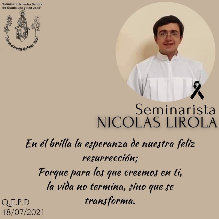 "Con profundo dolor queremos compartirles que el Seminarista Nicolas Lirola ha partido a la casa del Padre. Querido Nico descansa en la Paz del Señor al que buscabas servir y ahora contemplas! Recemos por su eterno descanso y el consuelo de su Familia!", dicta el comunicado.