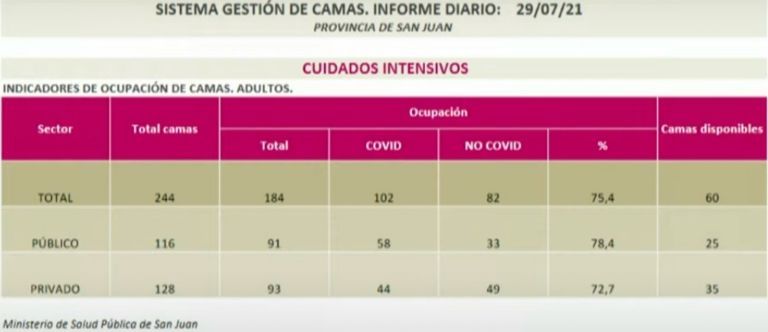 Este jueves, el Ministerio de Salud Pública dio a conocer el estado de ocupación de camas de terapia intensiva en San Juan. Actualmente, el 75,5% está cubierto. Es decir, 184 camas con pacientes. Y sólo quedan 60 plazas disponibles.