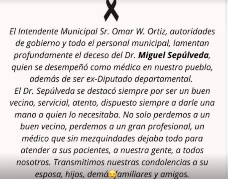 La muerte de un querido médico rural enluta al departamento Valle Fértil. Miguel Sepúlveda, el doctor del pueblo desde hace 25 años, perdió la vida este lunes producto de un ataque cardíaco. Las redes sociales se llenaron de mensajes de condolencias para con la familia del profesional.