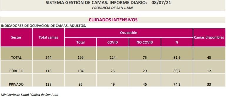 El Ministerio de Salud Pública informó la ocupación de las Unidades de Terapia Intensiva de San Juan. El nivel de alojamiento se mantiene estable: el 81,6% está ocupado. Es un porcentaje mayor a la media nacional, que es del 64,3%, esto es algo que se repite en el transcurso de las jornadas. En la provincia hay 199 pacientes internados. En esta ocasión, el sector público es el más comprometido. Hay sólo 12 plazas disponibles.