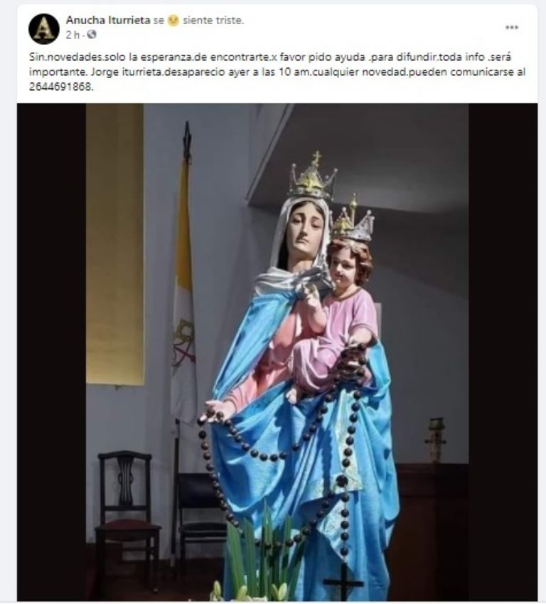 "Sin novedades. Solo la esperanza de encontrarte por favor pido ayuda para difundir toda info. Será importante. Jorge Iturrieta desapareció ayer a las 10 am. Cualquier novedad pueden comunicarse al 2644691868", publicó una integrante de la familia este viernes.
