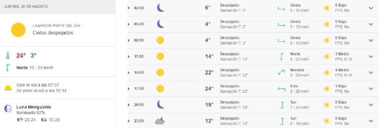 Tal como se anunció, este jueves será el día más cálido de la semana. Hasta habrá viento Norte, pero no llegará a ser el Zonda que azotó a la provincia días atrás.