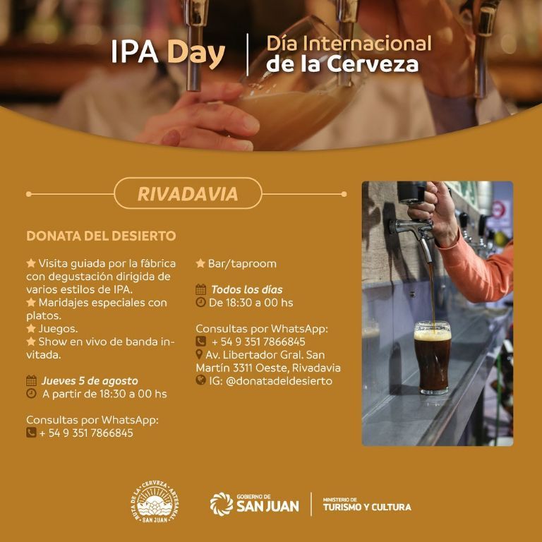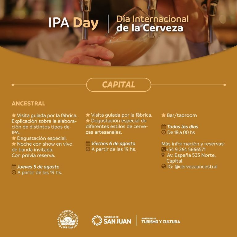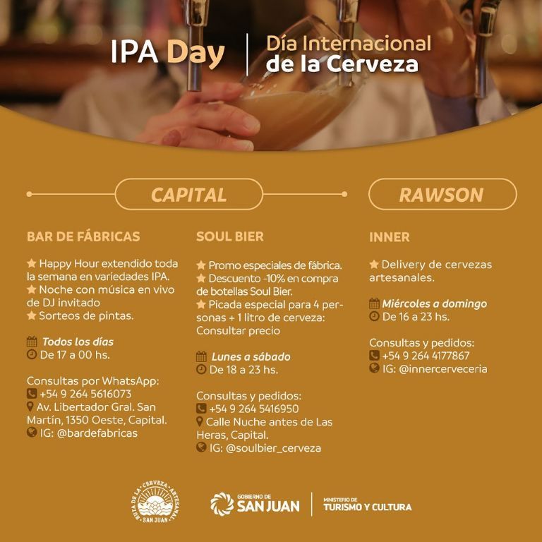 Bajo esta fecha popular en el mundo, el Ministerio de Turismo y Cultura de San Juan invita a las actividades especiales que se programaron en las fábricas y bares de la Ruta de la Cerveza Artesanal de la Provincia. Para los apasionados de esta tradicional bebida, habrá festejos que incluyen desde recorridos guiados, degustaciones y maridajes especiales, happy hour, además de shows de música en vivo