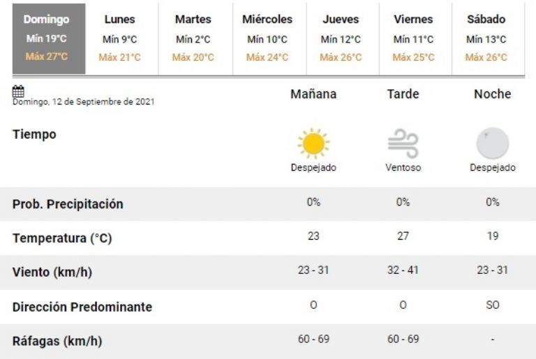 La jornada será ventosa y para la noche el SMN estima que el viento cambie de orientación y será del sector suroeste con una velocidad de 23 a 31km/h.