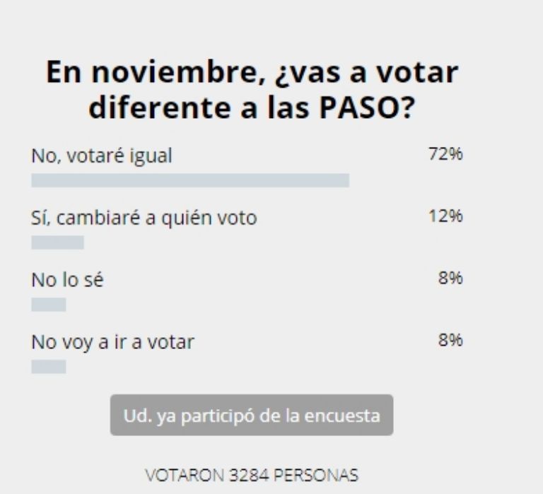 En medio de un tenso clima en la conducción nacional, derivada del mensaje que los argentinos dieron en las urnas de las Primarias, Abiertas, Simultáneas y Obligatorias (PASO), donde el Frente de Todos sufrió resultados adversos en la mayoría de las provincias argentinas, pero en San Juan consiguió una victoria, Tiempo de San Juan consultó entre sus lectores si en las próximas elecciones legislativas van a votar igual o no que en las PASO, dato de suma importancia para los candidatos que participarán de las elecciones del próximo 14 de noviembre.