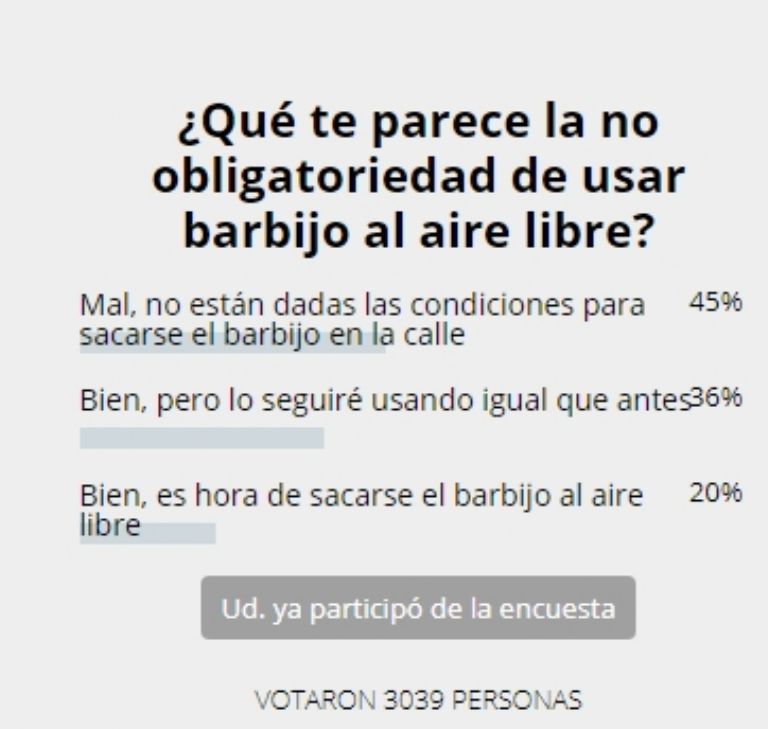 Por otro lado, el 45% de los participantes de la encuesta se mostraron en desacuerdo con la medida, porque consideran que "no están dadas las condiciones para sacarse el barbijo en la calle"