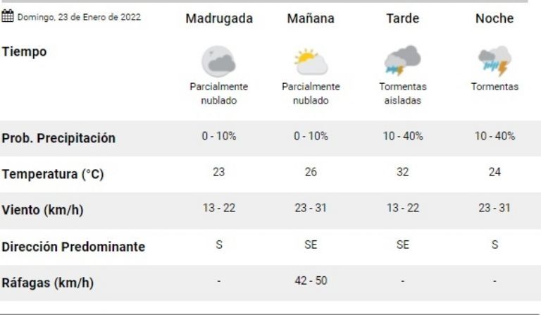 Por otra parte, el porcentaje de probabilidades de lluvias crece a un %40 por la tarde de este domingo, con chaparrones aislados sin grandes anuncios de caída de piedra, al menos para el ultimo día del fin de semana.