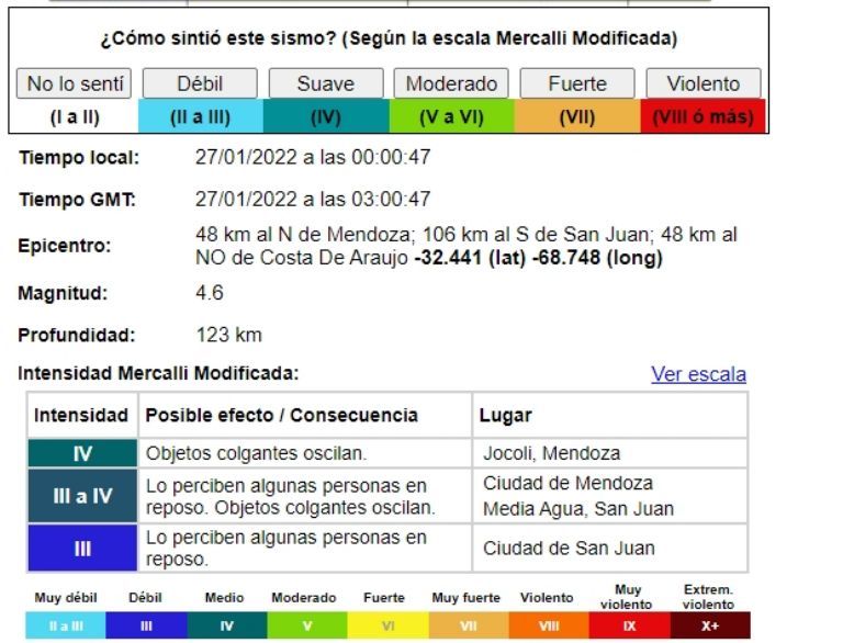 Un sismo se produjo a las 00.00 hs. de este jueves y provocó la alarma en Mendoza. Según los datos del Instituto Nacional de Prevención Sísmica fue de 4.7 grados y el epicentro se localizó a 44 kilómetros al norte de Mendoza y a 111 km al sur de San Juan.