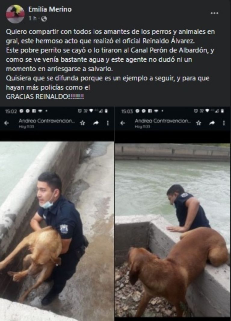 "Quiero compartir con todos los amantes de los perros y animales en gral., este hermoso acto que realizó el oficial Reinaldo Álvarez. Este pobre perrito se cayó o lo tiraron al Canal Perón de Albardón, y como se ve venía bastante agua y este agente no dudó ni un momento en arriesgarse a salvarlo. Quisiera que se difunda porque es un ejemplo a seguir, y para que hayan más policías como él. GRACIAS REINALDO!!!!!!!!", reza en el posteo de la usuaria.