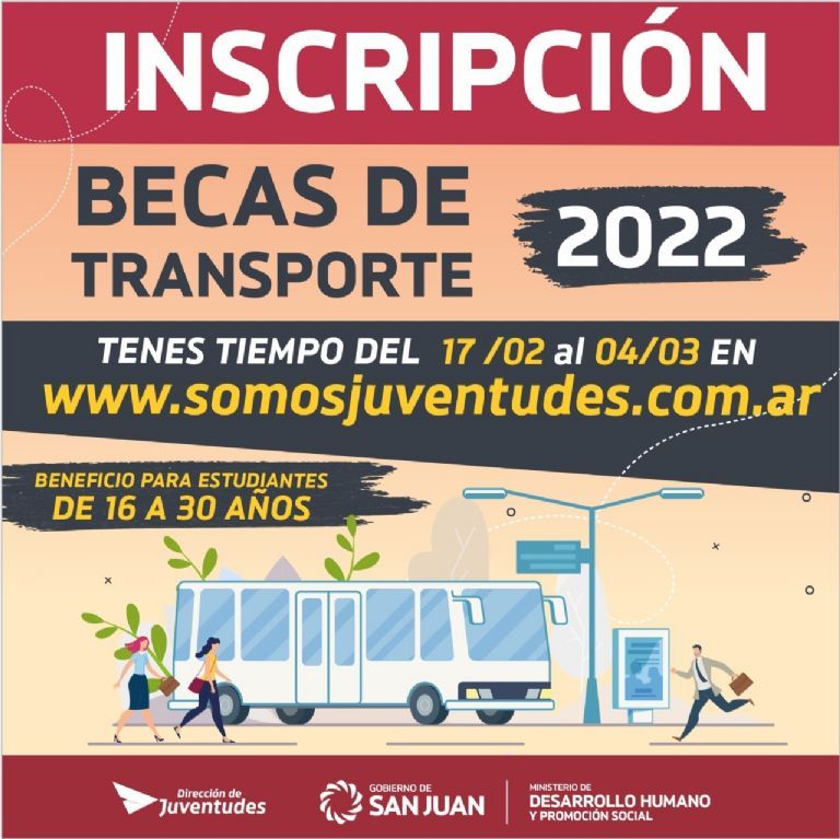 A partir del jueves 17 de febrero se habilitarán las inscripciones para las becas de transporte que otorga la Dirección de Juventudes, dependiente del Ministerio de Desarrollo Humano. Similar al 2021, se buscará beneficiar a 8.000 jóvenes sanjuaninos con esta herramienta para poder continuar con sus estudios.