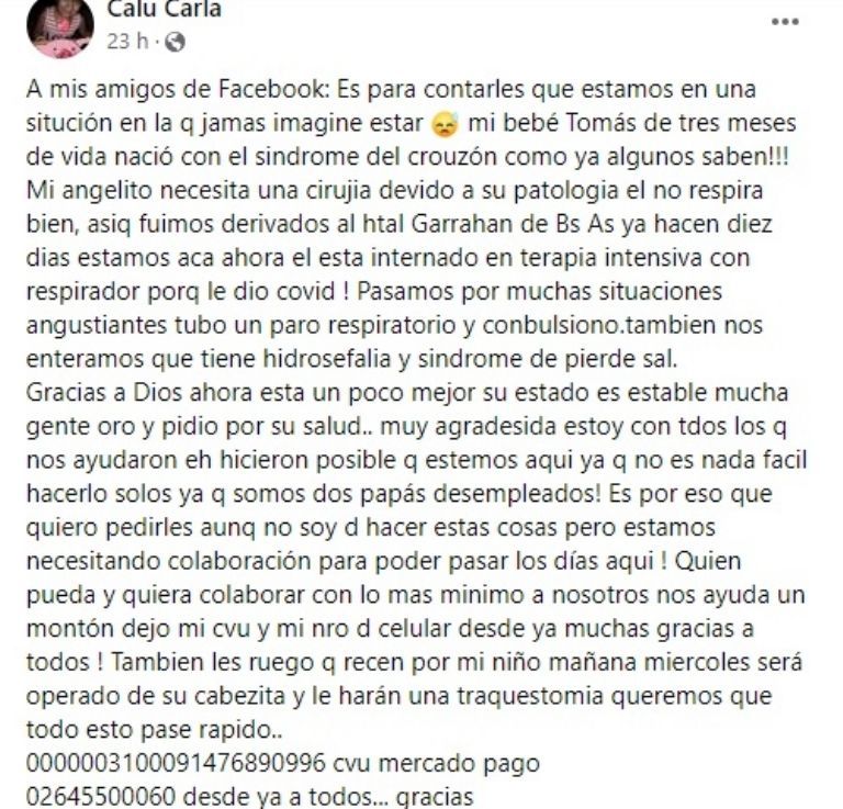 "Ahora está internado en Terapia Intensiva con respirador porque le dio Covid. Pasamos por muy malas situaciones y nos enteramos que también tiene hidrocefalia", relató Carla en Facebook.