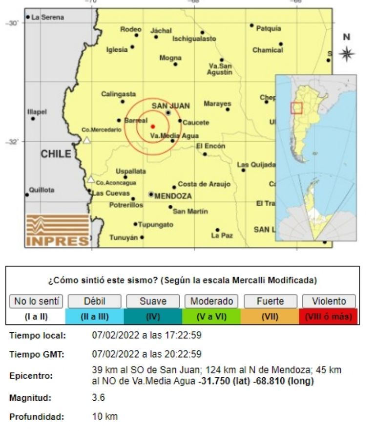 Este lunes a las 17:22 San Juan se movió con un nuevo sismo, según los datos aportados por el INPRES. El temblor tuvo una magnitud de 3.6 y una profundidad de 10 km.