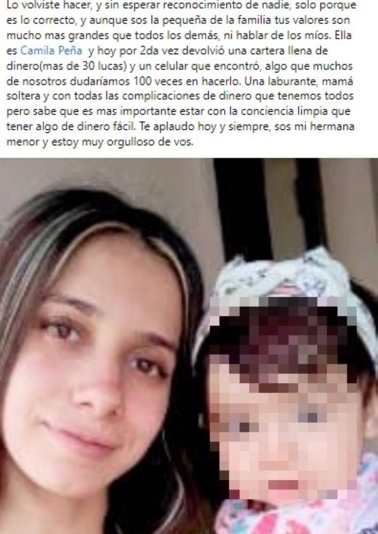 "Lo volviste hacer, y sin esperar reconocimiento de nadie, solo porque es lo correcto, y aunque sos la pequeña de la familia tus valores son mucho mas grandes que todos los demás, ni hablar de los míos. Ella es Camila Peña y hoy por 2da vez devolvió una cartera llena de dinero(mas de 30 lucas) y un celular que encontró, algo que muchos de nosotros dudaríamos 100 veces en hacerlo", escribió Nahuel en su cuenta de Facebook.