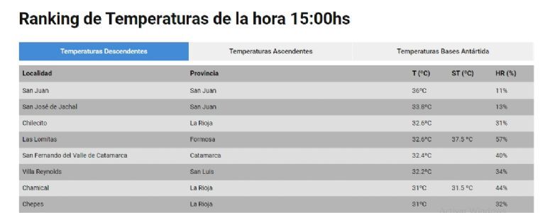 De acuerdo a lo que informa el SMN en su Ranking de Temperaturas, a la hora 15 San Juan era la provincia más calurosa del país, con 36°, seguido justamente por San José de Jáchal con 33.8°. Y luego, más alejado en un 3° lugar se ubica Chilecito, La Rioja, con 32.6°. Actualmente sopla en la provincia un viento del sector norte a razón de 22 km/h.