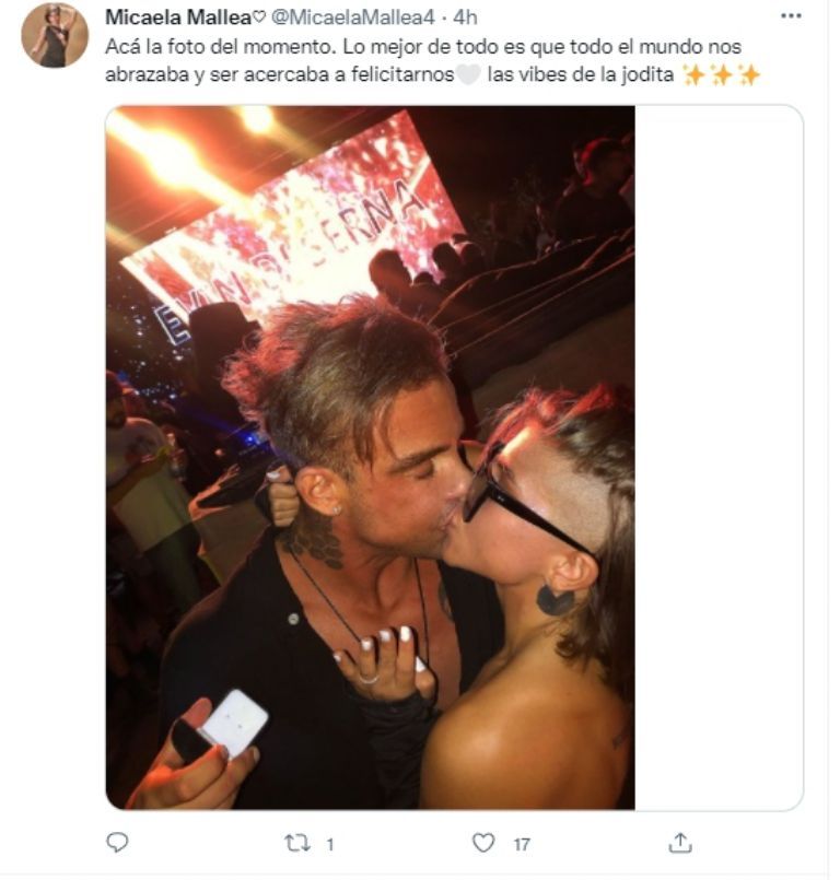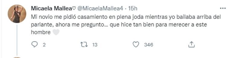 Según contó la estudiante, DJ y fitness todo ocurrió mientras compartían un evento: "mi novio me pidió casamiento en plena joda mientras yo bailaba arriba del parlante, ahora me pregunto… que hice tan bien para merecer a este hombre ??", escribió en la red social del pajarito. Este mensaje cuenta con casi 350 me gusta por el momento. Además relató que ella dijo que sí, y que todo el mundo los abrazaba y felicitaba luego de la propuesta.