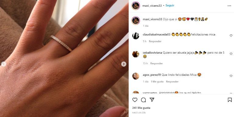 En otra de las publicaciones mostró una foto del anillo que le dio y Maximiliano, su pareja, hizo lo mismo. El joven es de Mendoza y al igual que ella comparte muchas fotos de sus arduos entrenamientos y su físico.