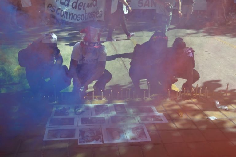 Con pancartas y carteles con diferentes frases, se congregaron en la puerta y en la entrada prendieron velas con imágenes de las mujeres que fueron asesinadas en San Juan.