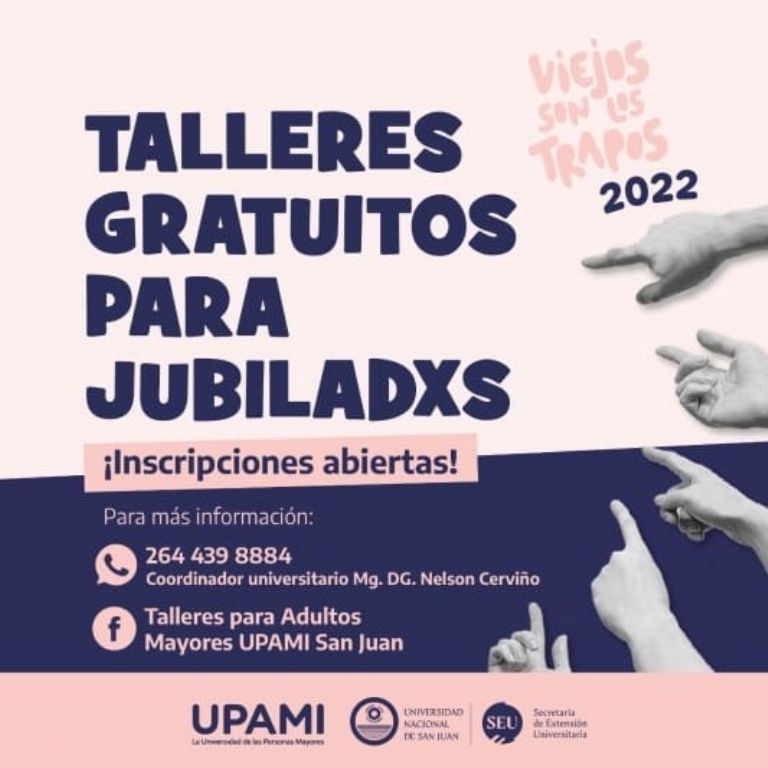 Bajo el lema "Viejos son los trapos", estos cursos gratuitos son una interesante propuesta para que los adultos mayores puedan formarse en diferentes áreas. La inscripción puede hacerse por teléfono al 2644398884 o en forma presencial en el Rectorado de la UNSJ en calle Jujuy y Mitre, donde los interesados se pueden anotar tanto para los cursos presenciales como para los virtuales.