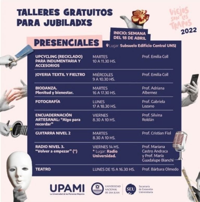 Para más información, los interesados e interesadas pueden llamar al teléfono consignado o por Facebook en Talleres para Adultos Mayores UPAMI San Juan. Los talleres inician en la semana del 18 de abril.