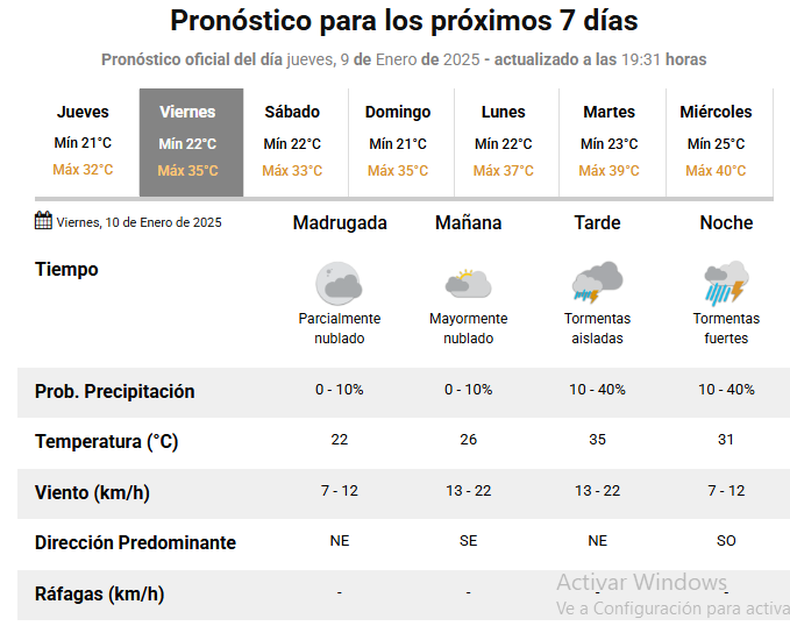 Las lluvias todavía tendrán dos días más en la provincia, según pronosticó el Servicio Meteorológico Nacional (SMN). Para este viernes 10 de enero, se espera una mínima de 22º y una tarde muy calurosa con 35º de promedio. Sin embargo, el cielo seguirá parcialmente nublado durante toda la jornada hasta la tarde cuando se esperan tormentas aisladas que antecederán a las tormentas fuertes por la noche.