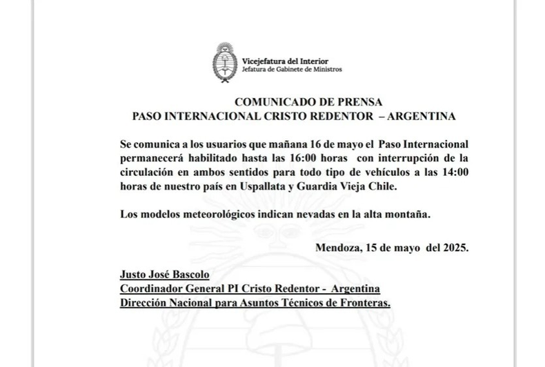 Justo antes del fin de semana, las autoridades a cargo del Paso Internacional Cristo Redentor, que une a Mendoza con Chile, emitieron un comunicado de prensa importante para todas las personas que planean viajar por el camino. Según indicaron, este viernes "16 de mayo el Paso Internacional permanecerá habilitado sólo hasta las 16:00".