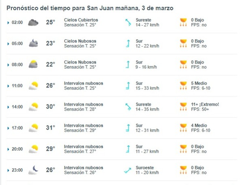 Para la jornada de este domingo 3 de marzo se espera que el cielo continúe con gran nubosidad pero bajaron drásticamente las probabilidades de lluvia durante la jornada. Para la tarde del sábado, la posibilidad de precipitaciones bajó a un 40%. Por su lado, el viento, que sopla del Sureste, y seguirá con la misma intensidad hasta la noche previa de este domingo.